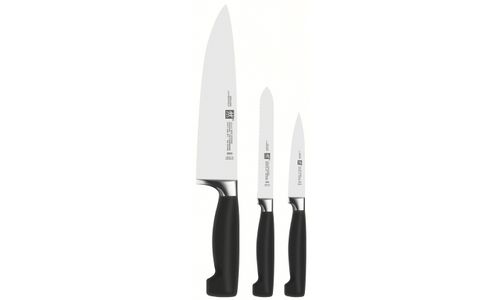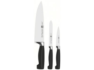 De 3-delige messenset bevat kleine en lichte messen en snijmessen, die met zijn slanke mes ideaal zijn voor het schillen van fruit en groenten, evenals het bereiden en plukken van vlees. Het middelgrote mes is bijzonder veelzijdig. Hiermee kunt u comfortabel en precies worst, kaas en andere koude maaltijden snijden en bereiden. Het stevige, zware koksmes met zijn brede mes is een allrounder onder de snijgereedschappen van ZWILLING. De naadloze kunststof handgrepen zijn ergonomisch gevormd en zorgen te allen tijde voor nauwkeurige geleiding. De messenset uit de serie ®VIER STARS rust uw keuken op een professionele en exclusieve manier uit en biedt u een comfortabele en precieze bereiding van talloze gerechten.