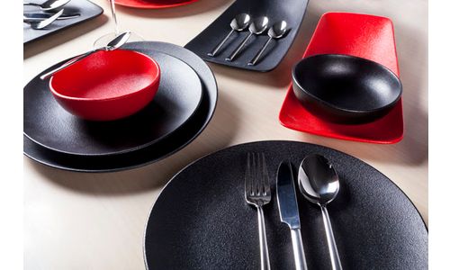 In porselein, wat de bediening vergemakkelijkt, want lichter dan aardewerk. Heeft ook een meer geraffineerde look dan aardewerk. Bovendien garandeert de verhoogde rand een vlotte bediening.