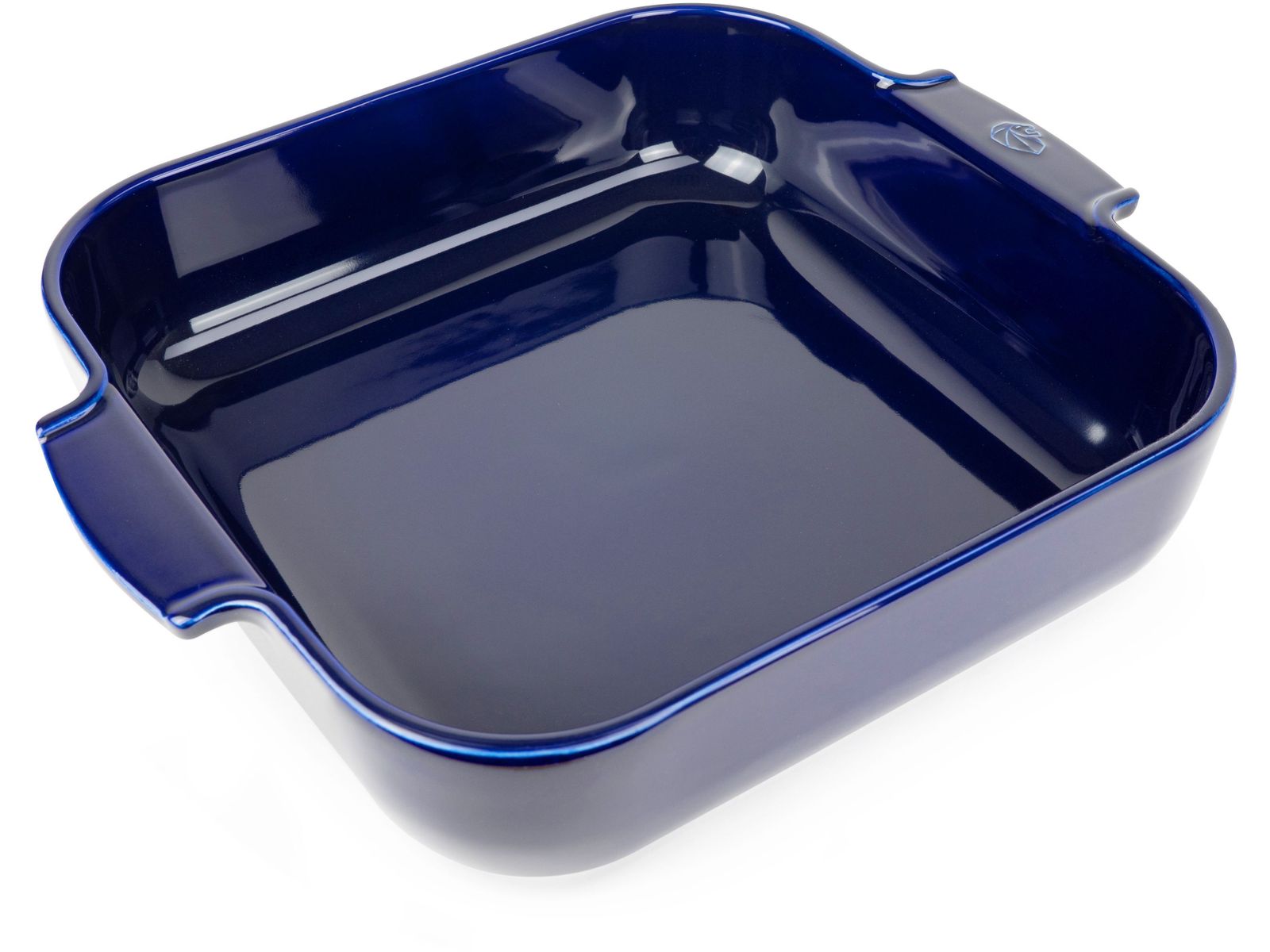 Een verbazingwekkend glanzende diepblauwe kleur voor deze vierkante keramische schaal 36 cm van Peugeot.