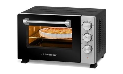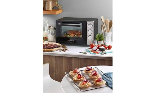 Met zijn roestvrijstalen en matzwarte afwerking past deze compacte oven gemakkelijk in elke keuken.