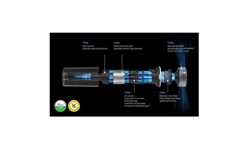 Het vijflaagse HEPA-filtersysteem* geeft schone lucht af. De cyclonische hoofdfilter en de metalen netfilter verzamelen grote stofdeeltjes, de Jet Cyclone- en microfilter filteren fijne stofdeeltjes uit de lucht, en een filter voor ultrafijn stof houdt 99,999%** van de microstofdeeltjes tegen, waaronder deeltjes en allergenen van 0,3~10µm***.