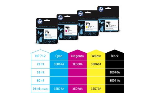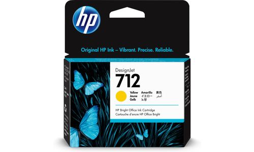 HP 712 29 ml inktcartridge voor DesignJet, geel. Type kleureninkt: Pigmentgebaseerde inkt, Inkjet Cartridge Type: Normaal rendement, Type aanbod: Enkele verpakking, Volume gekleurde inkt: 29 ml, Printkleuren: Geel, Aantal per verpakking: 1 stuk(s)