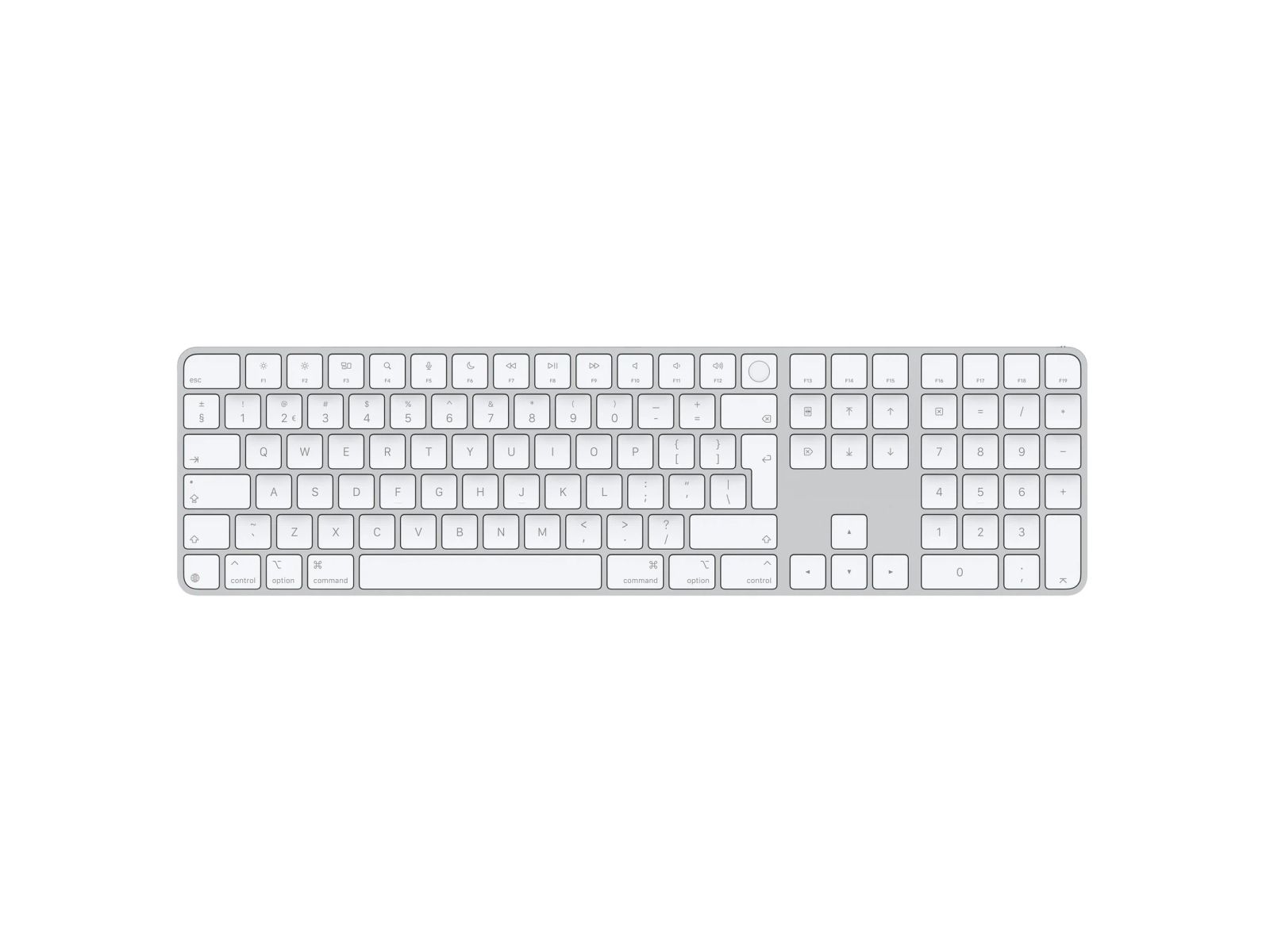Magic Keyboard is verkrijgbaar met Touch ID, waarmee je snel, makkelijk en veilig inlogt en aankopen doet. Op het Magic Keyboard met Touch ID en numeriek toetsenblok typ je heel prettig en nauwkeurig. Het heeft een grotere lay?out met handige toetsen om door documenten heen te swipen, en pijltoetsen die van pas komen bij het gamen. Het numerieke toetsenblok is ideaal als je veel met spreadsheets en cijfers werkt. Dit toetsenbord is draadloos en heeft een oplaadbare batterij die zonder tussentijds opladen voldoende stroom levert voor ongeveer een maand. Het toetsenbord maakt automatisch verbinding met je Mac, dus je kunt meteen aan de slag. Er zit een USB?C-poort op en er wordt een geweven USB?C-oplaadkabel meegeleverd. Daarmee kun je je Magic Keyboard aansluiten op een USB?C?poort op je Mac om te pairen en op te laden.