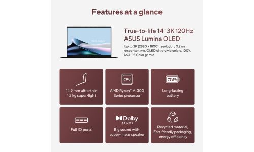 ASUS Zenbook 14 OLED UM3406KA-QD132W. Type product: Laptop, Vormfactor: Clamshell. Processorfamilie: AMD Ryzen AI 7, Processormodel: 350, Frequentie van processor: 2 GHz. Beeldschermdiagonaal: 35,6 cm (14"), HD type: WUXGA, Resolutie: 1920 x 1200 Pixels. Intern geheugen: 32 GB, Intern geheugentype: LPDDR5x-SDRAM. Totale opslagcapaciteit: 1 TB, Opslagmedia: SSD. On-board graphics adapter model: AMD Radeon 860M. Inclusief besturingssysteem: Windows 11 Home. Kleur van het product: Zwart
