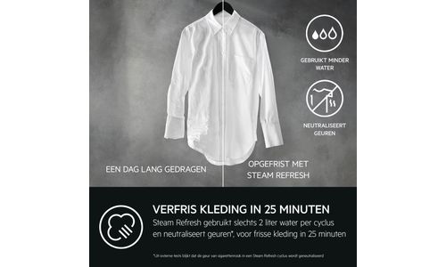 Steam Refresh neutraliseert geurtjes* en vermindert kreuken in kledingstukken, ook in fijne was, in slechts 25 minuten. En als je van een extra boost frisheid houdt, voeg je gewoon onze aromatische stoomgeur toe. Dat geeft het die net gewassen frisheid.