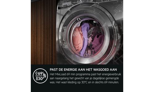 Het MixLoad 69 min programma past het energieverbruik aan naargelang het gewicht van je dagelijkse gemengde was. Het wast kleding op 30°C en in slechts 69 minuten. Behaal optimale prestaties en uitstekende wasresultaten met MixLoad 69 min.